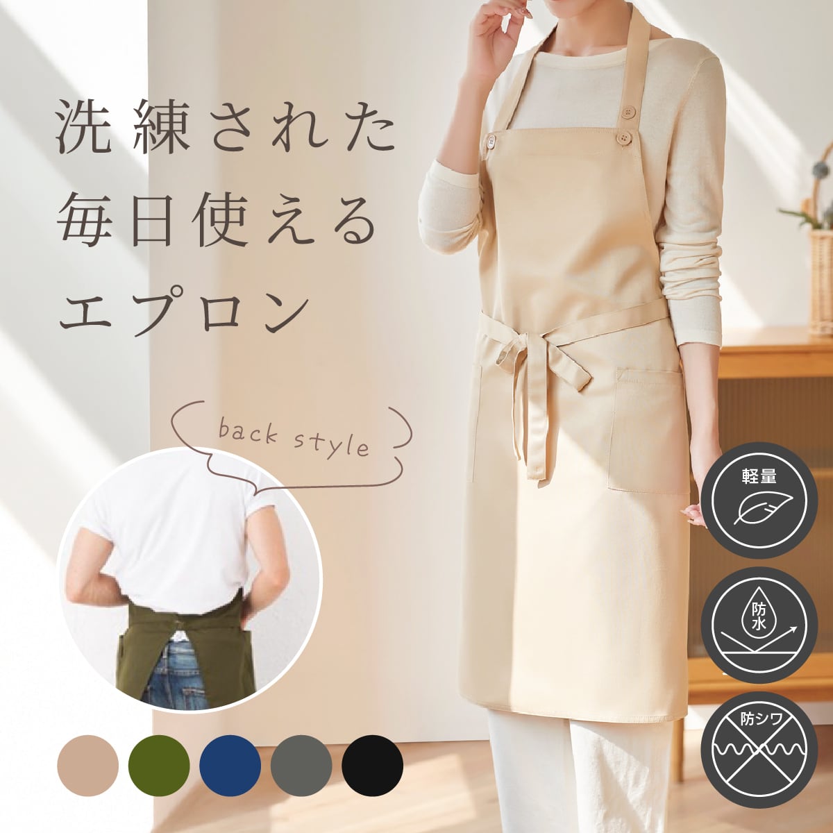 ・肩紐は2段階で調整ができるため、体型に合わせてサイズ調整がしやすくなっています。エプロンはご自宅で洗濯でき、お手入れが簡単です。