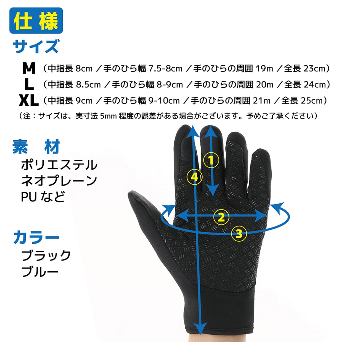 L(中指長 8,5cm、手のひら幅8-9cm、手のひらの周囲20cm、全長24cm)